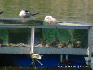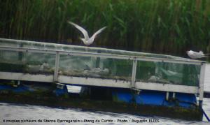 Sur le radeau de l'étang du Curnic, des naissances de Sterne Pierregarin ont eu lieu récemment. Actuellement, on peut y observer 4 gros poussins et 2 plus jeunes. Un couple couve encore.
