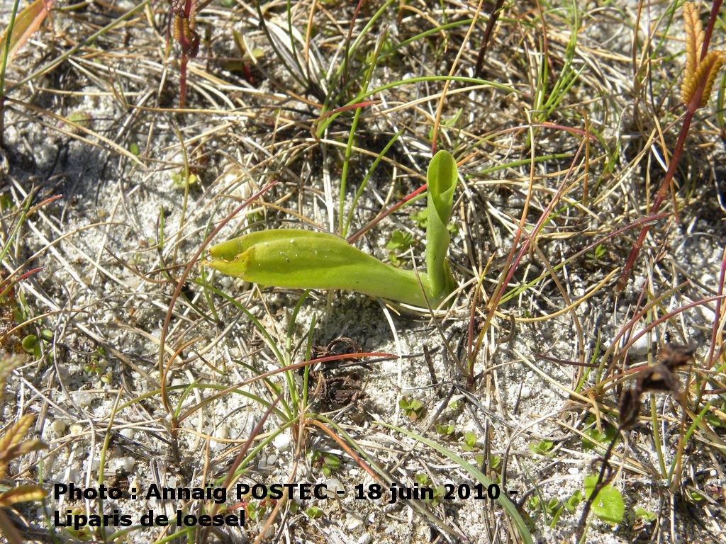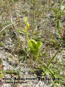 Liparis de loesel sortant du sable, en fleur et plant dont l'inflorescence a été mangée par des mollusques :