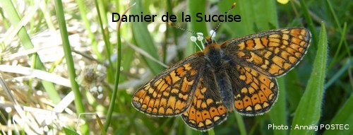Le papillon le Damier de la succise, papillon protégé au niveau européen, vit dans les prairies humides, tourbeuses où la fleur "la succise des près" à l'origine de son nom est très abondante. Il pond sous les feuilles de cette plantes :