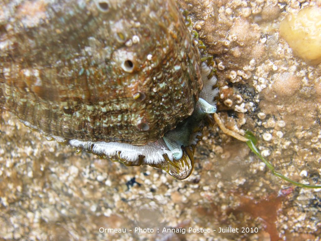 (Précisions : cette ormeau a été décollé de son rocher pour l'observation, il a ensuite été remis sur le site. Il est interdit en Bretagne de pêcher l'ormeau du 15 juin au 31 août.)