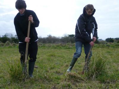Annaïg Postec, la chargée de mission Natura 2000 de Guissény et nous, les deux stagiaires (Hoël Perhirin élève de terminal STAV à l'IREO de Lesneven et Romuald Ranc élève de Seconde Professionnelle GMNF) nous sommes attaqués à 40 plants d'herbe de la pampa avec comme armes 2 bêches et une pioche. Cette plante invasive peut produire jusqu'à 10 millions de graines fertiles. En fonction du vent et du climat les graines peuvent s'eparpillées dans un rayon de 25 kilomètres. (Pour visualiser la plaquette du Conseil Général 29 sur les invasives : CLIC !)